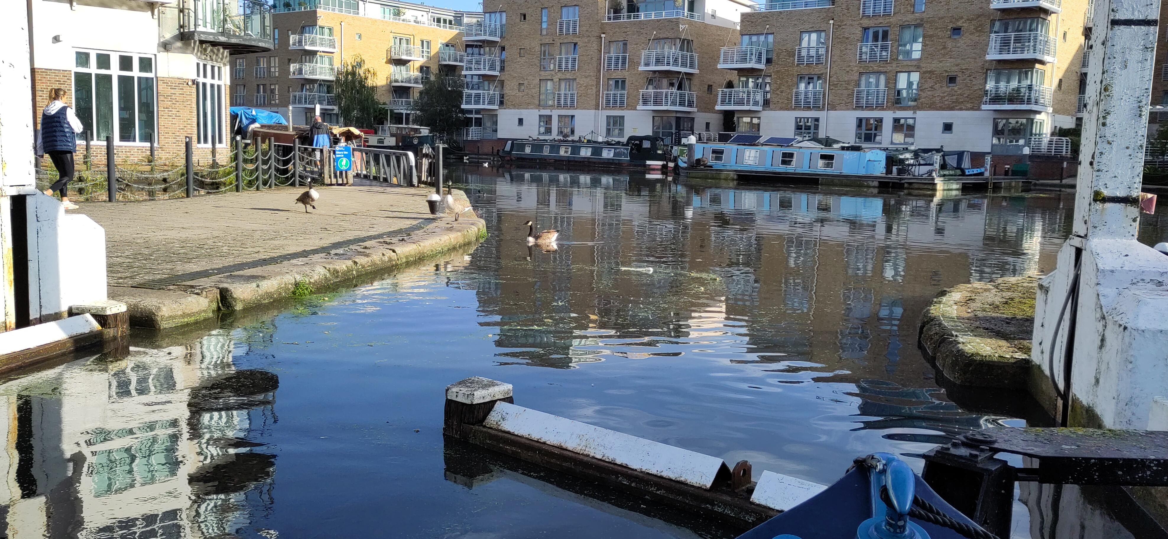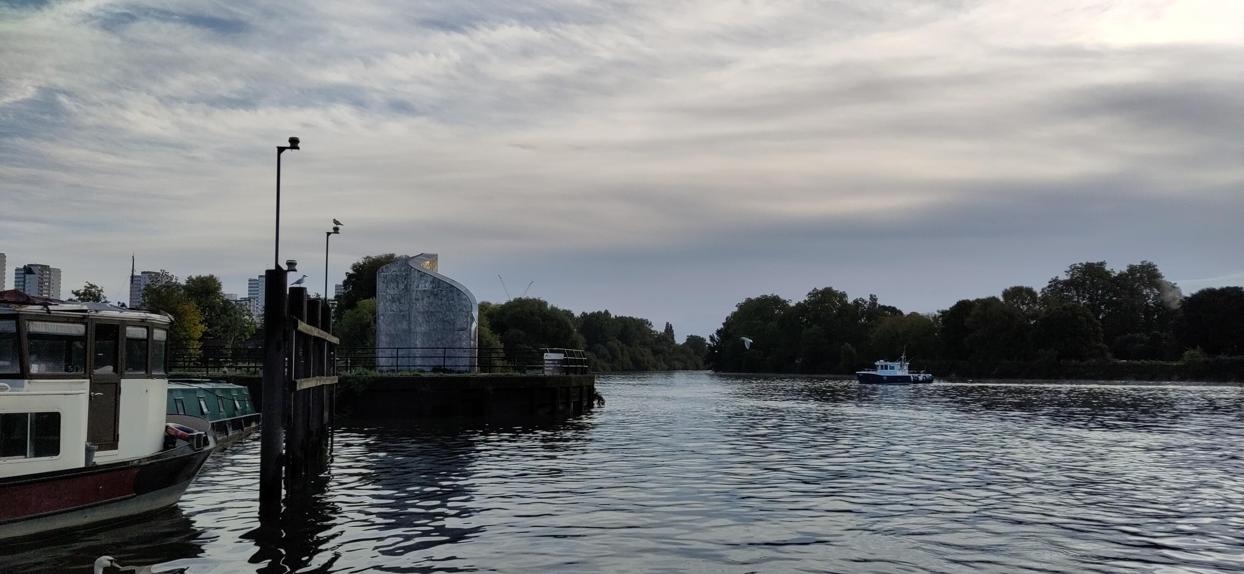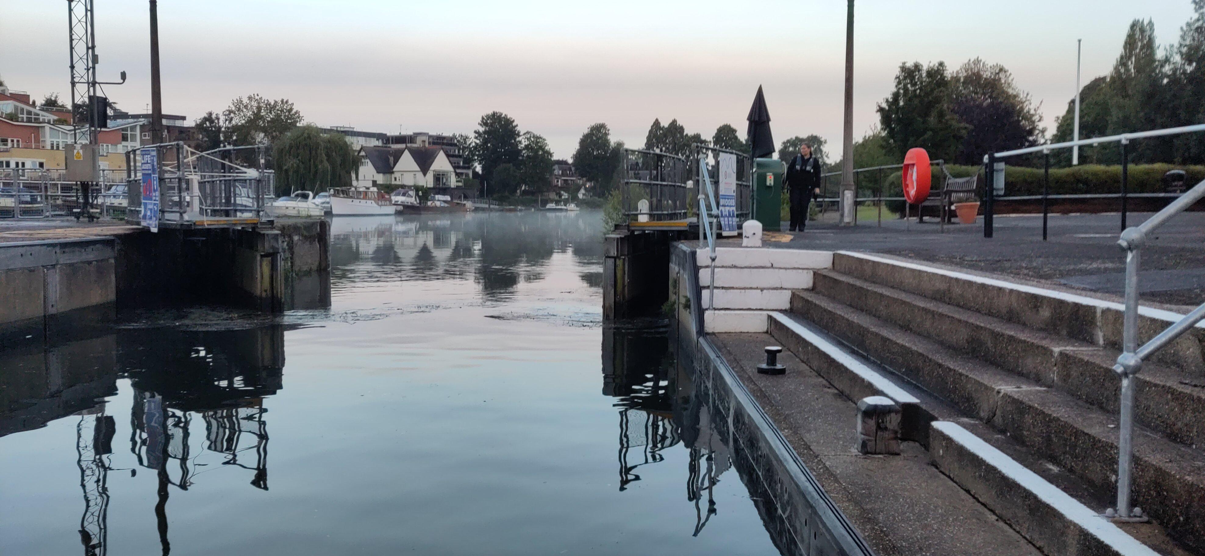 The Thames below Teddington Lock is tidal. Narrowboats can only safely traverse this section of the river around the time of high tide. When the tide is rushing in or out, the water moves faster than the top speed of our boat. We had a passage booked to leave the lock a little before high tide. For the previous few days, high tide has been before dawn and we are not equipped for travelling in those conditions.