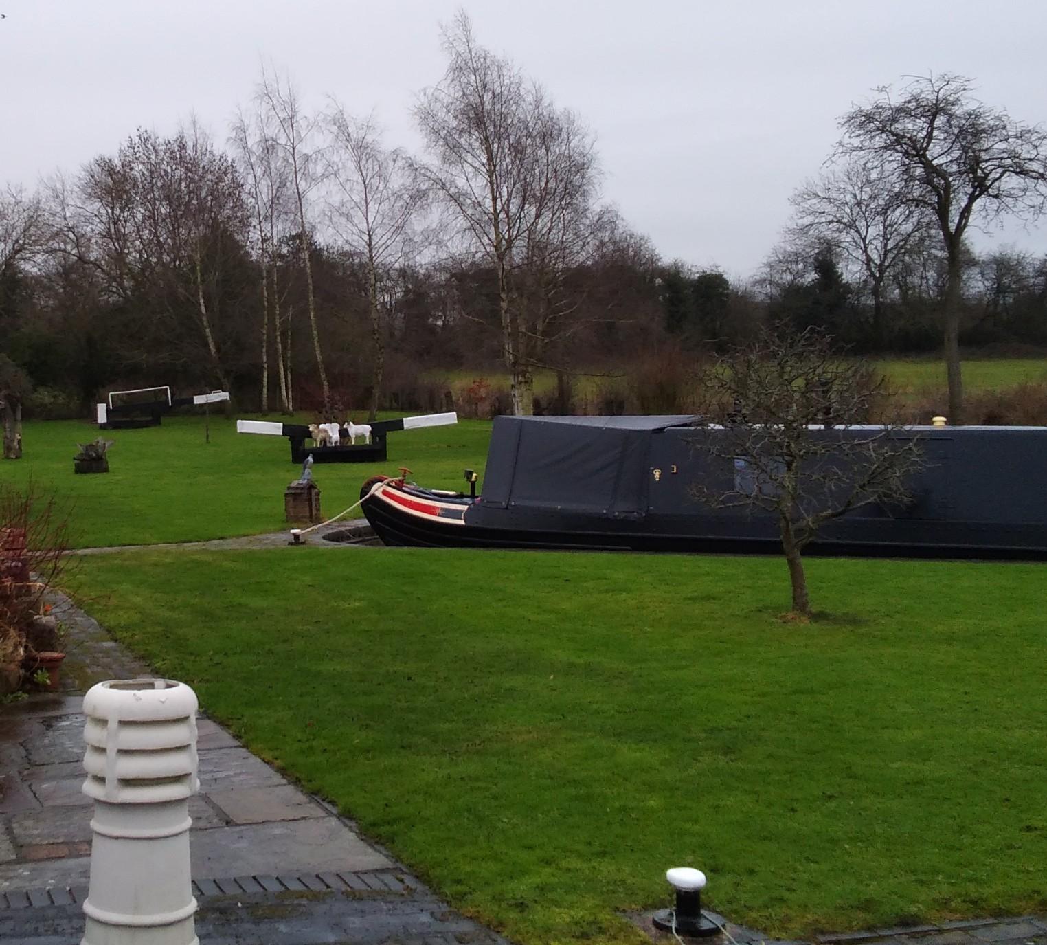 After lunch there were more locks to do and Shane wanted to work them and be warmer, so we swapped over jobs after lunch. Apart from some smirr on my specs, all went well. We had in the meantime passed the garden with a lock we remembered from before. I hadn’t noticed the gate saying Boat yard and I am sure there were no model sheep then.