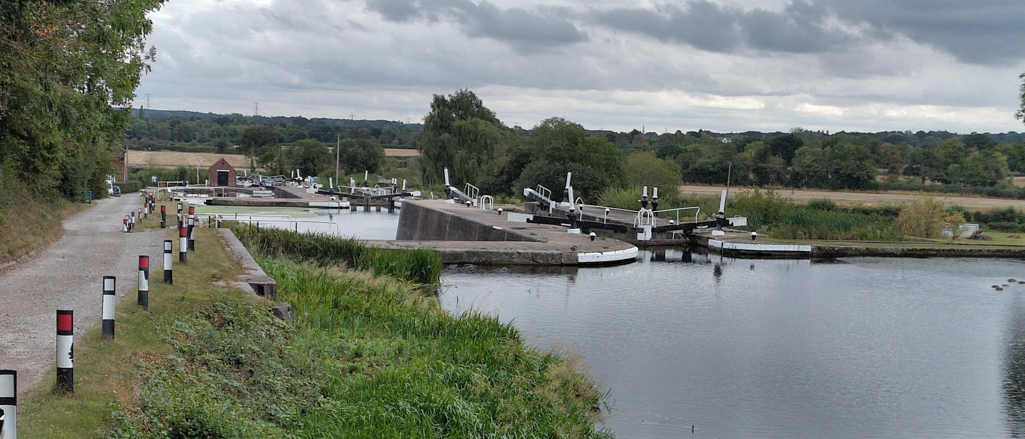 As we went slowly past moored boats approaching the Knowle Locks, somebody on a boat asked if we were wanting water. We were, and were told that was fine as they had just filled up - a slightly confusing message. I hoped it would became obvious if we waited, and it did. There was a very long hose running along the hedge, used by the permanently moored boaters. We now knew we could ignore the cardboard sign asking us to leave it on and hook our hose up instead.
