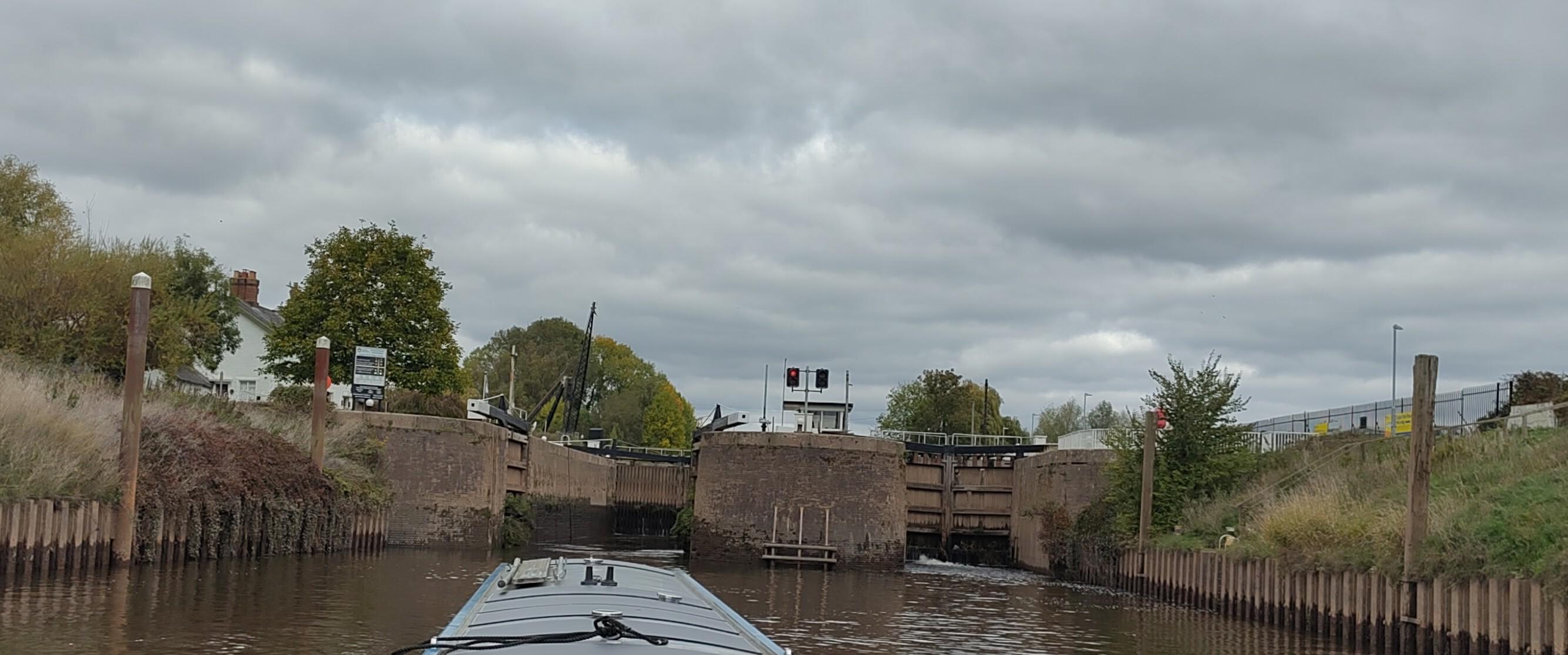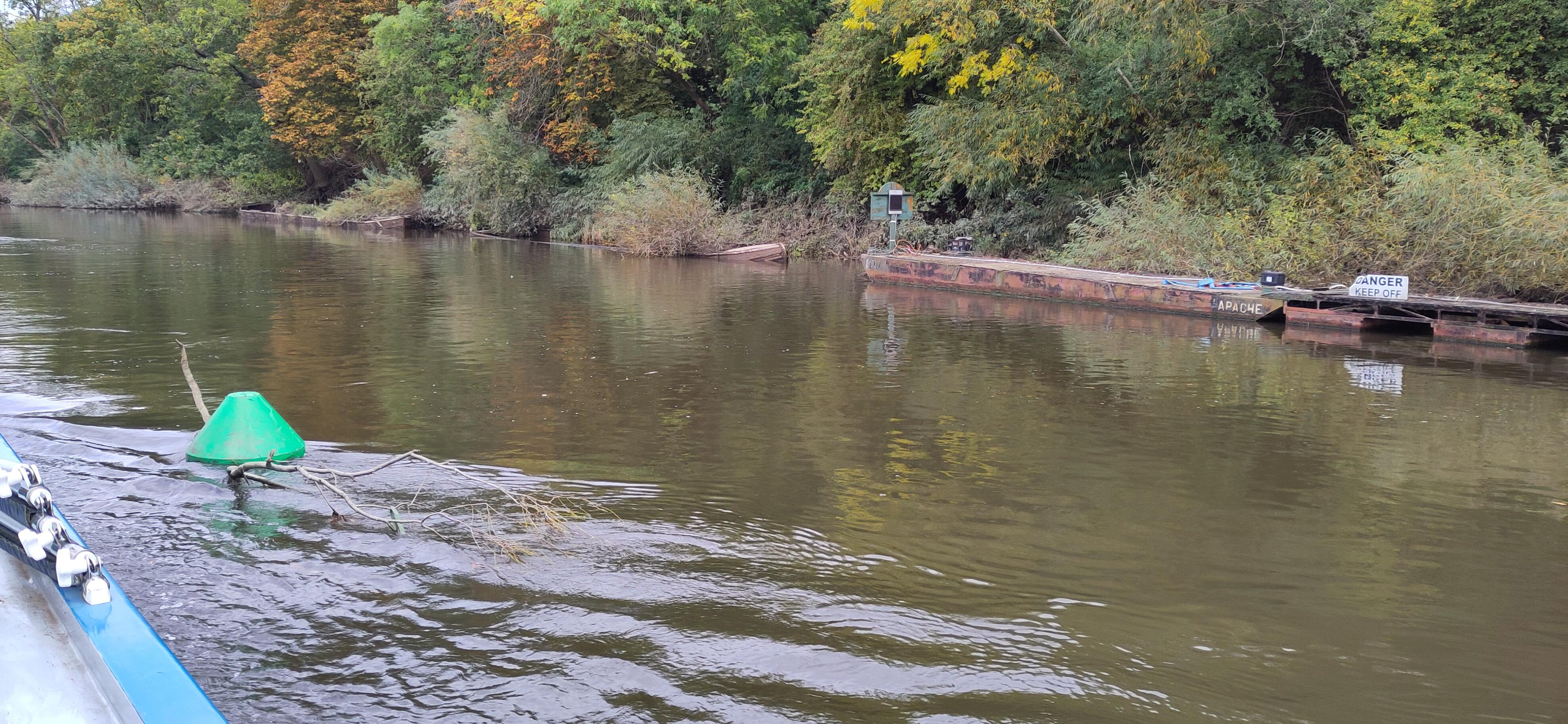 The rule of the river is to keep right, but just before we reached Worcester, I saw some navigation buoys in the water. These were green and triangular and sitting in the middle of the river. The rule, going upstream, is "keep the green floaty things on the right" (a variation on a notice we saw in Abingdon). It didn't feel like the right thing to do on this left-hand corner, but the buoys weren't there by accident. I reduced speed a little, just in case, but everything worked as it should.