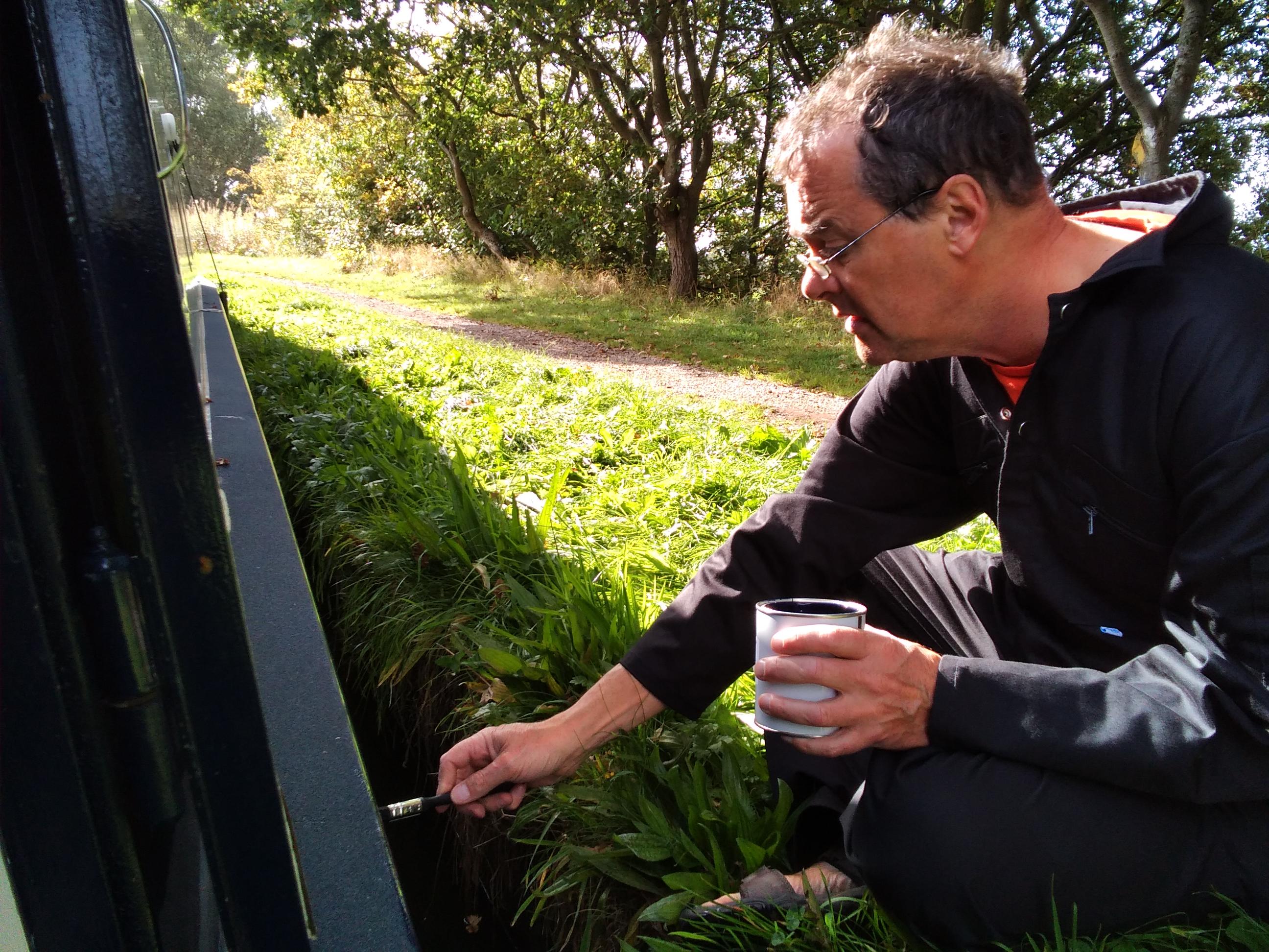 Shane finished the starboard blue, so we carefully turned the boat round with more rope than engine, taking care not to step or rub ropes on the wet paint. It is a slower process without the bow thruster, but much quieter. As it happens, just as we had been wondering if we’d hear back about possible solutions to the thruster issue, we got a reply today, while Shane was painting, telling us they thought they knew the cause and had already ordered the replacement part – a new joystick. What fun!