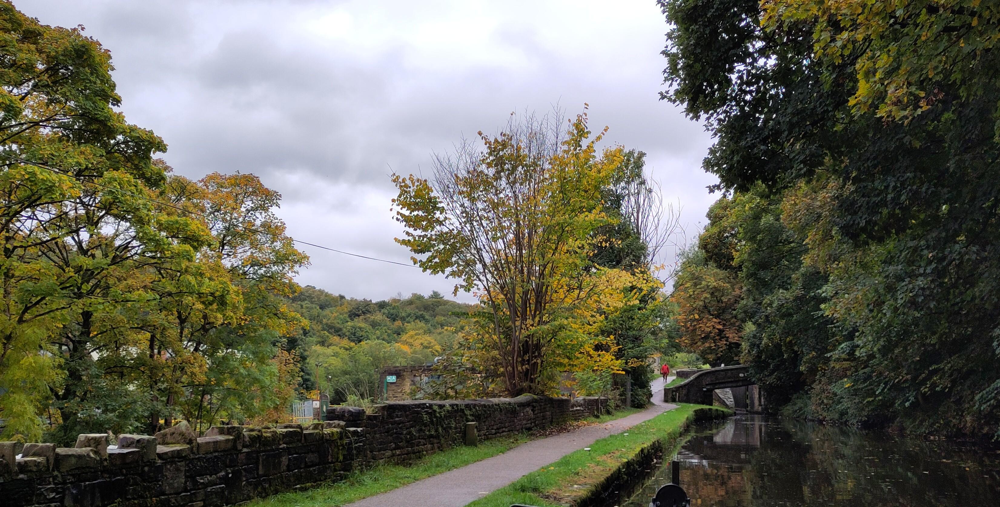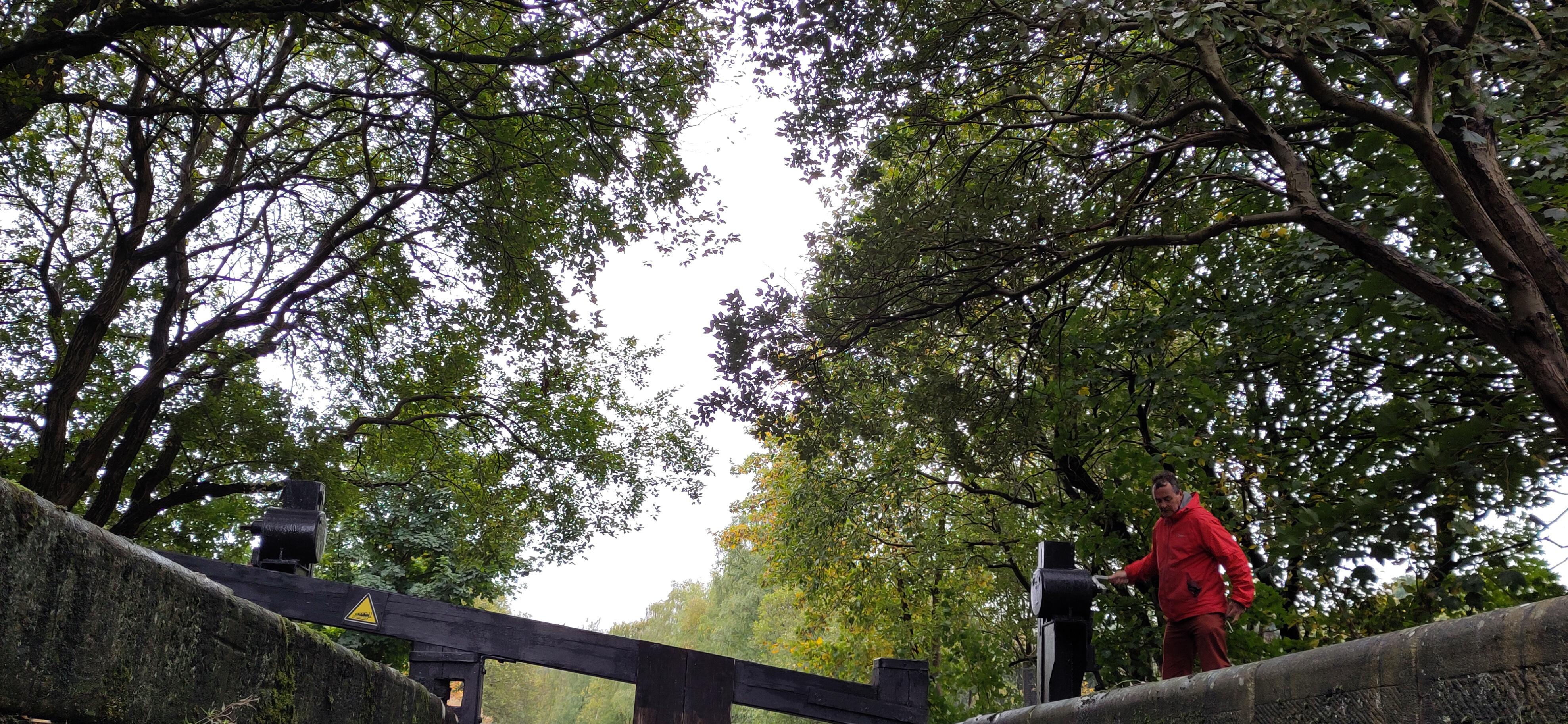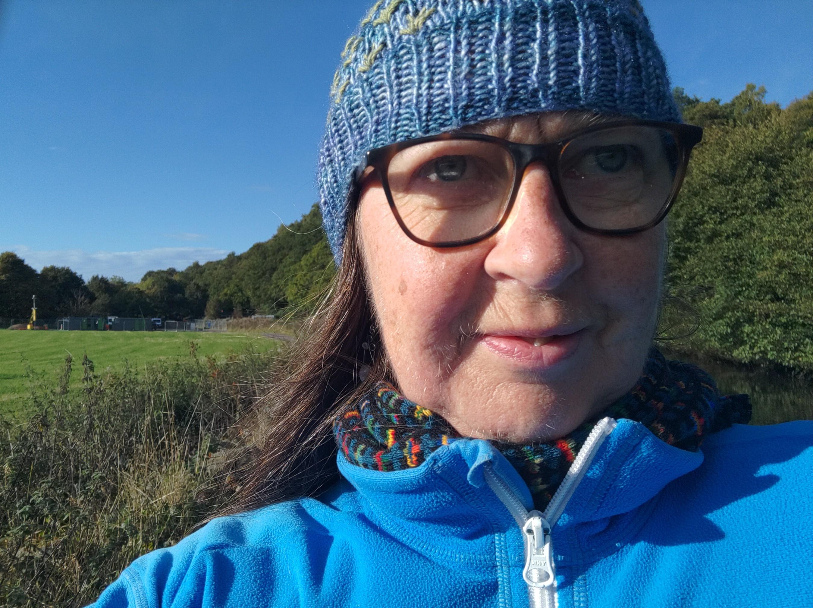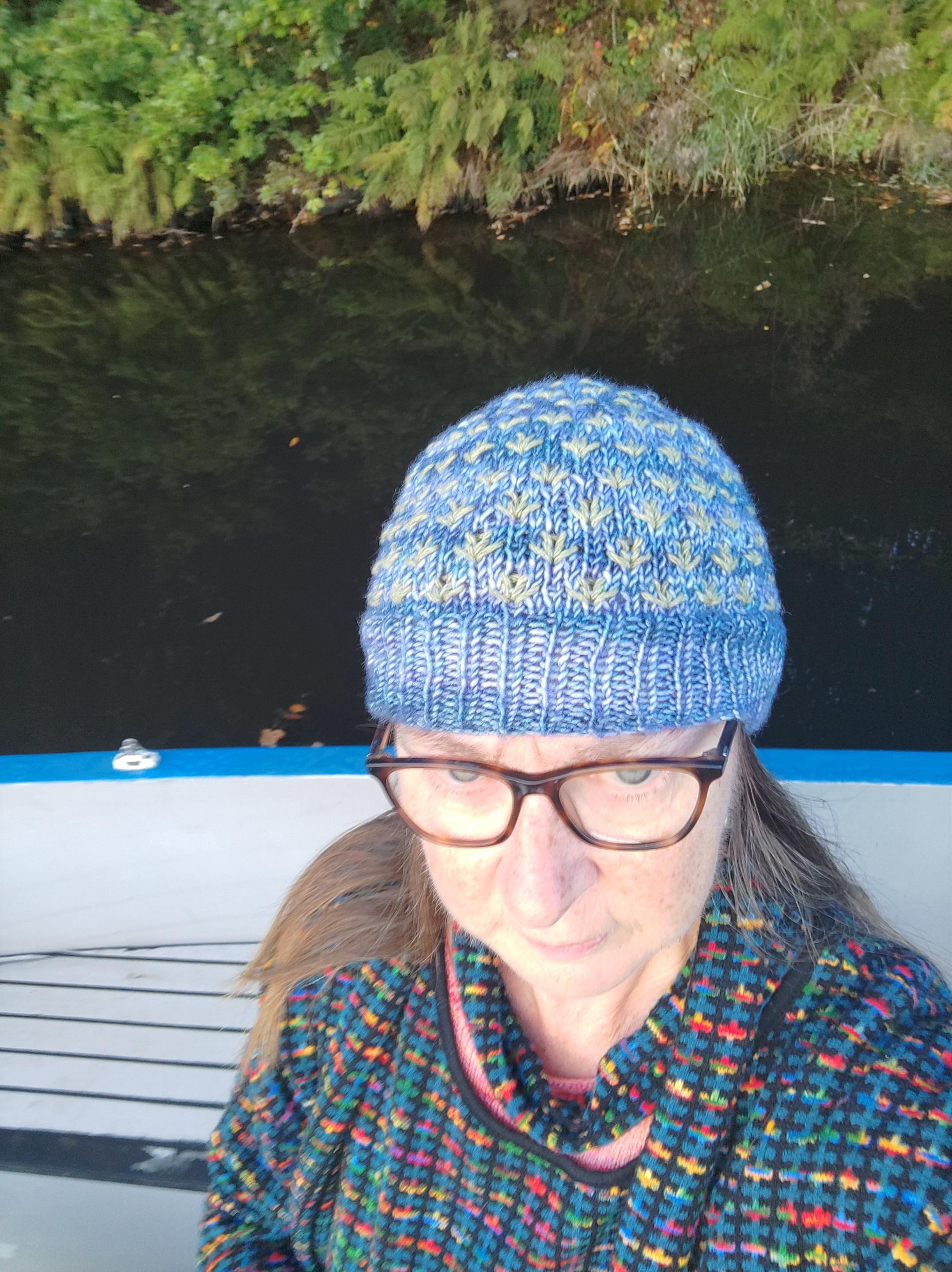 In the morning I went outside to see if I could get some photos to share with my knitting friends, in the sunshine. A man and his dog came past and had a chat with me. I noticed his large dog was looking inquisitive and before the man noticed, it had stepped aboard. The man began calling “Hey, come on Caesar, come here, naughty dog!” but Cæsar was trotting past me towards the open door and looking in to our kitchen. I held Caesar’s collar, while I closed the doors and he turned and returned to the man while I explained I didn’t want him to head down the steps, or it might have been hard work getting him out again. Caesar was just a nosy, placid creature. They headed off and I continued with the photoshoot. I was not making a great job of the selfies, but the hat was confy and I decided to wear it to do the locks. It was plenty warm enough but more sky coloured than canal coloured today.