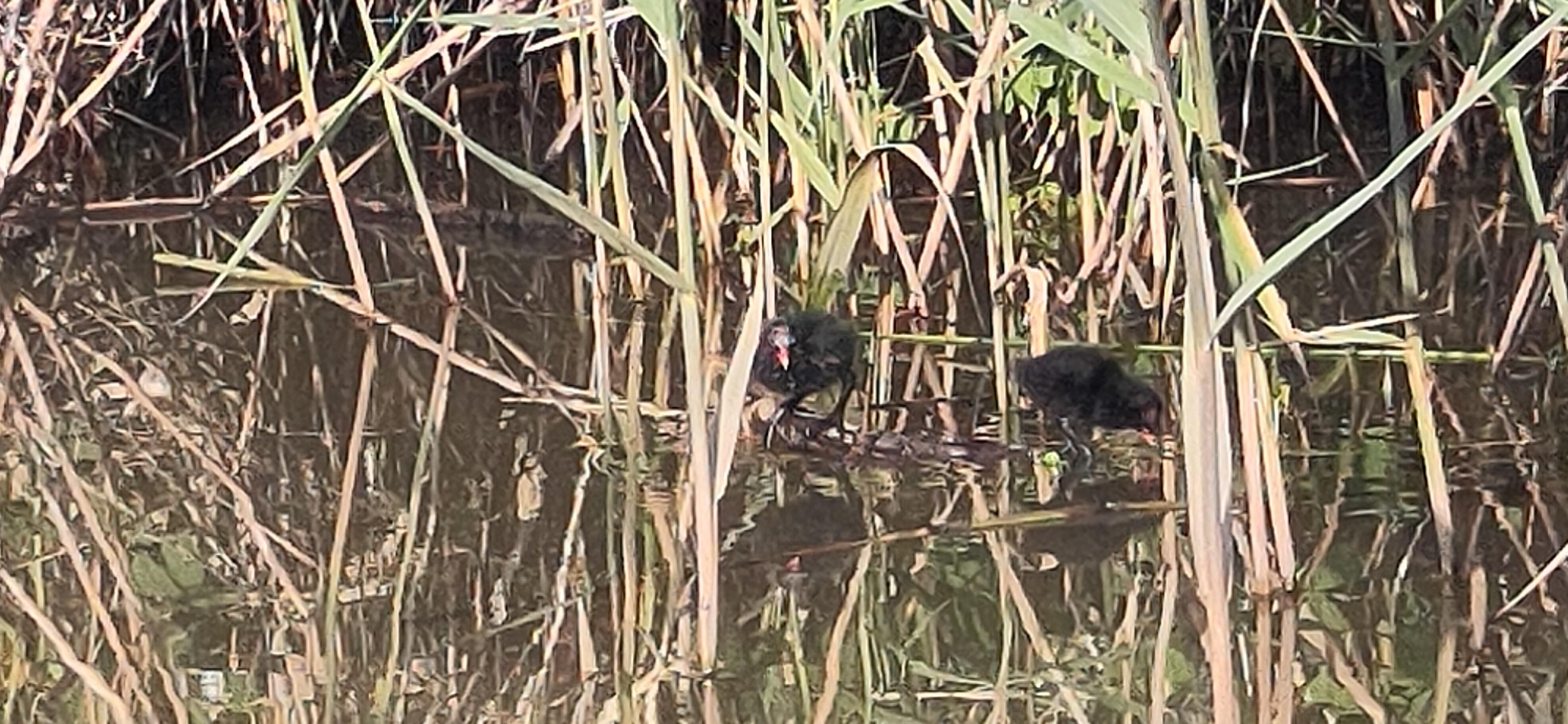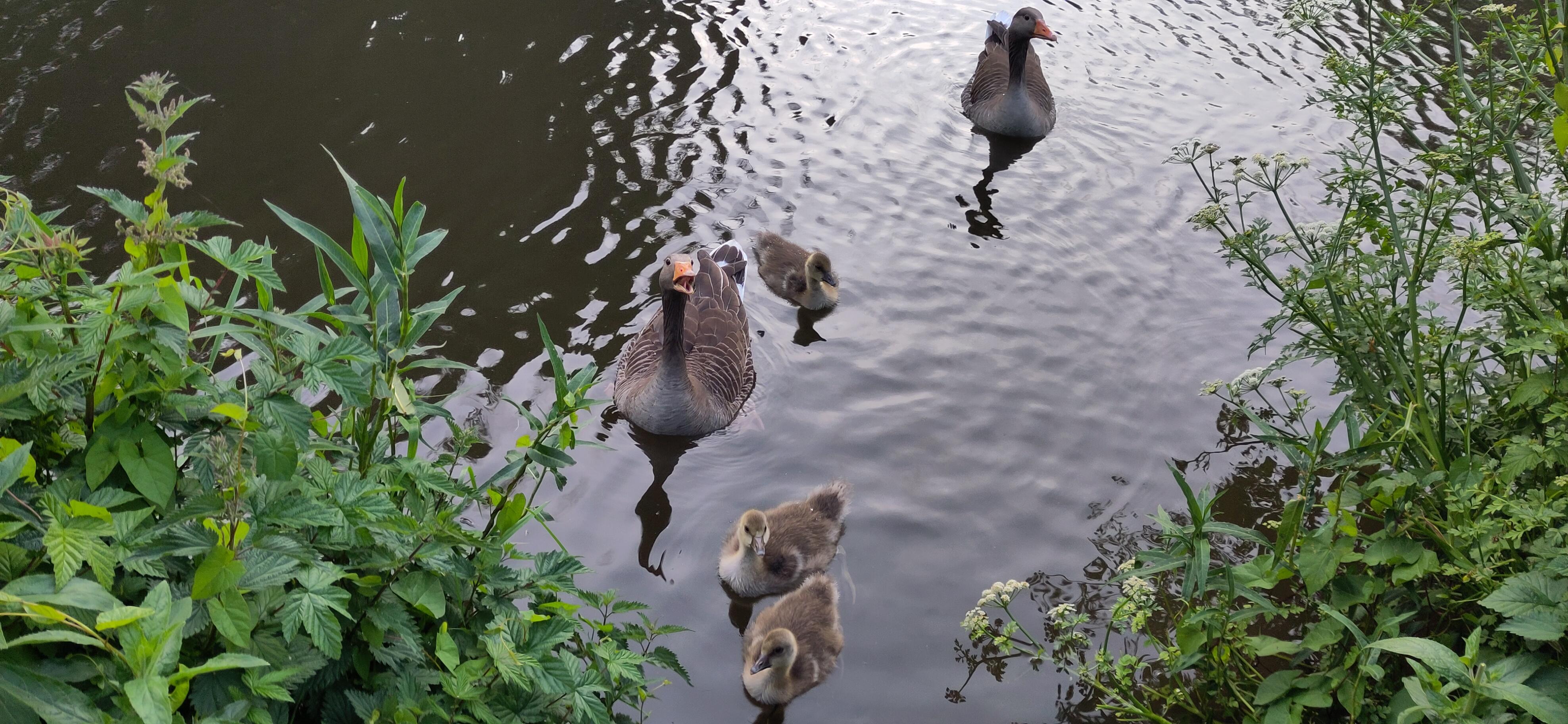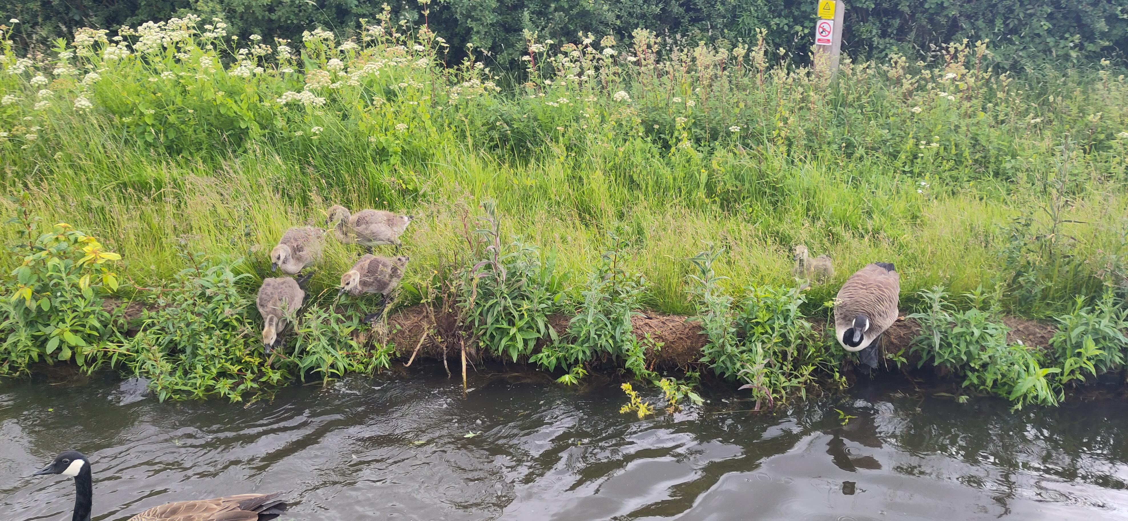 We got a quick look at some webbed feet in action when a group of goslings on the bank, strangely, decided they were safer in the water than the bank as we drove past, gradually letting themselves into the water, gripping the grassy edge before plopping down. It was fun to watch them all go in.